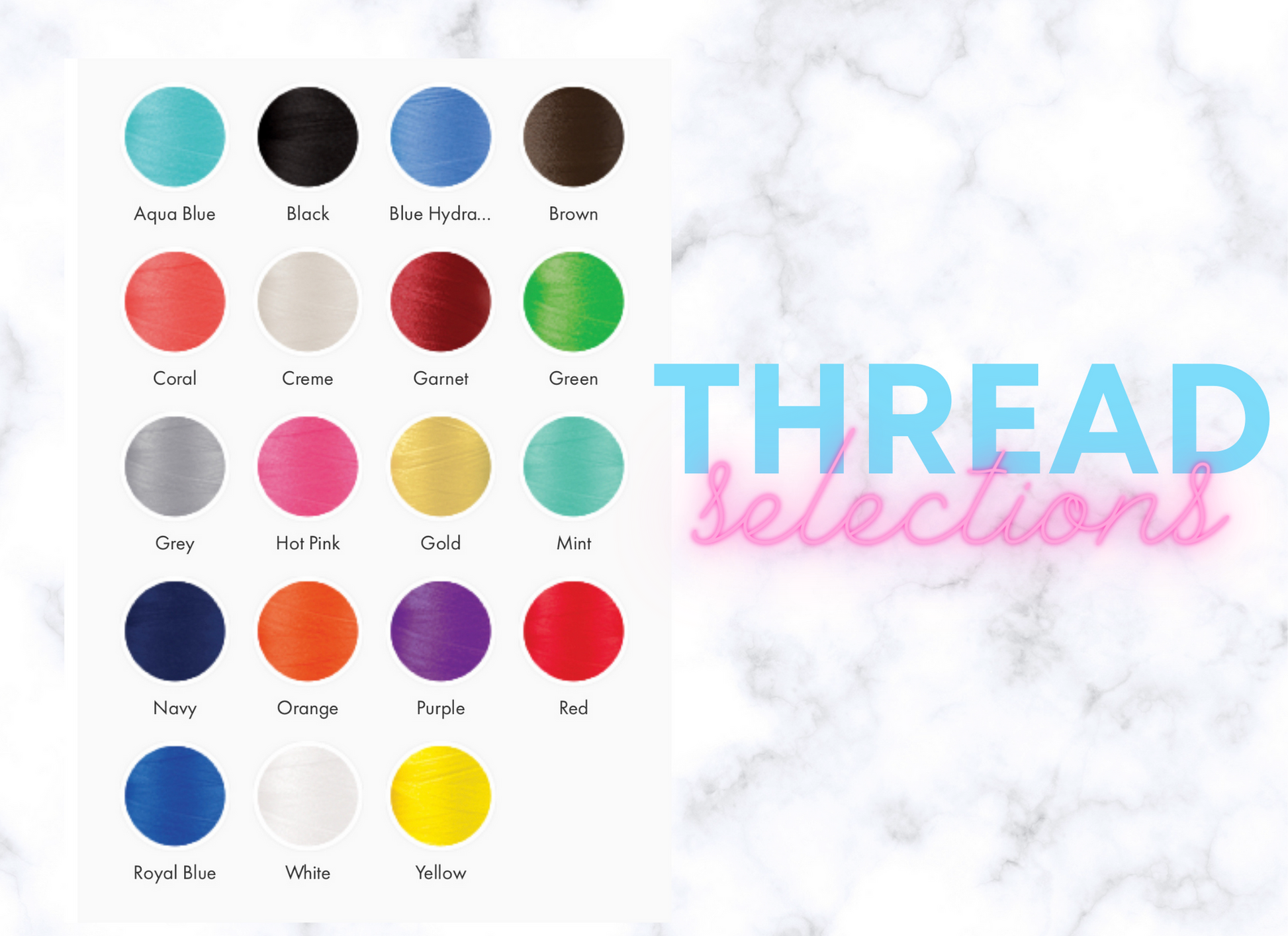 Please double-check the spelling on personalization, shipping address, font choice, and thread colors. If no color is chosen bag will be stitched in sellers choice of thread.